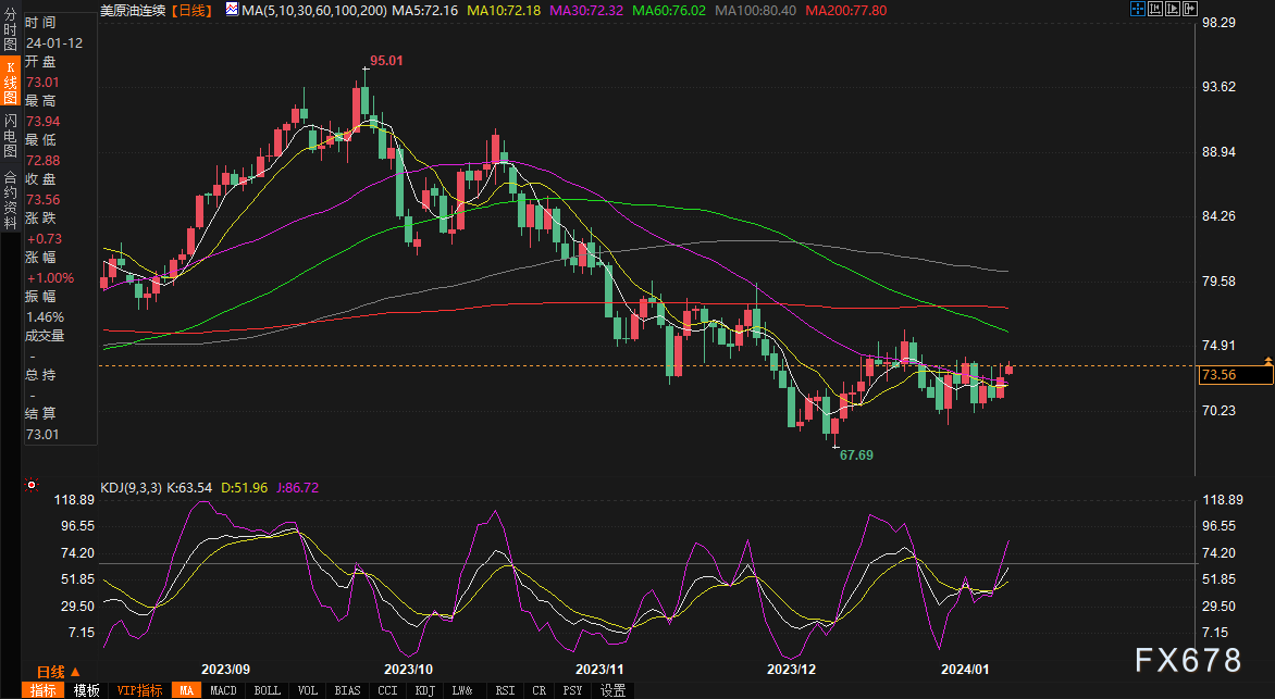 汇通财经APP讯——周五(1月12日),欧盘时段,在中东地缘政治紧张情绪的推动下,美原油连续震荡走高,现报73.45,涨0.84%。