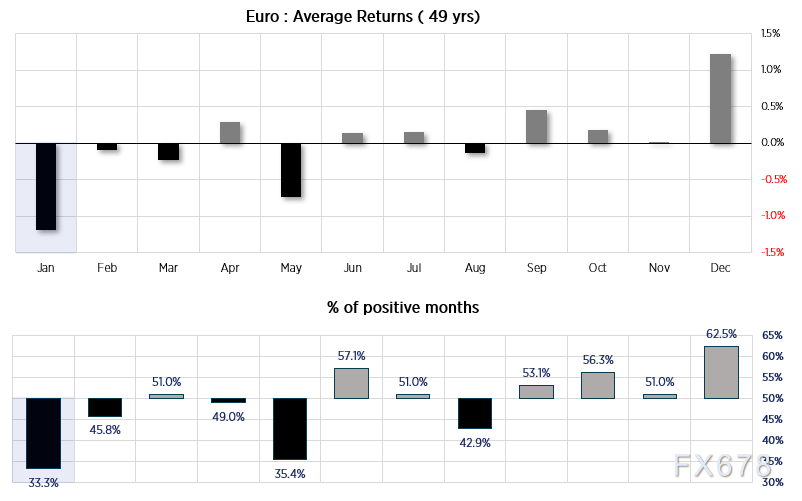 对外汇交易员来说,2024年开局平静,1月以来,欧元兑美元的波动幅度仅为1.6%。从历史上的季节性表现来看,1月通常表现较差。根据一份1975年以来的数据,1月平均回报率为-1.2%,在66.7%的时间里收盘下跌。过去五年里,欧元/美元在1月份连续四年收低。2023年1月上涨1.5%,是五年内唯一上涨的年份。距本月结束还有两周时间,截至目前,本月欧元/美元跌0.7%,欧元/美元可能还有更多的下行空间。