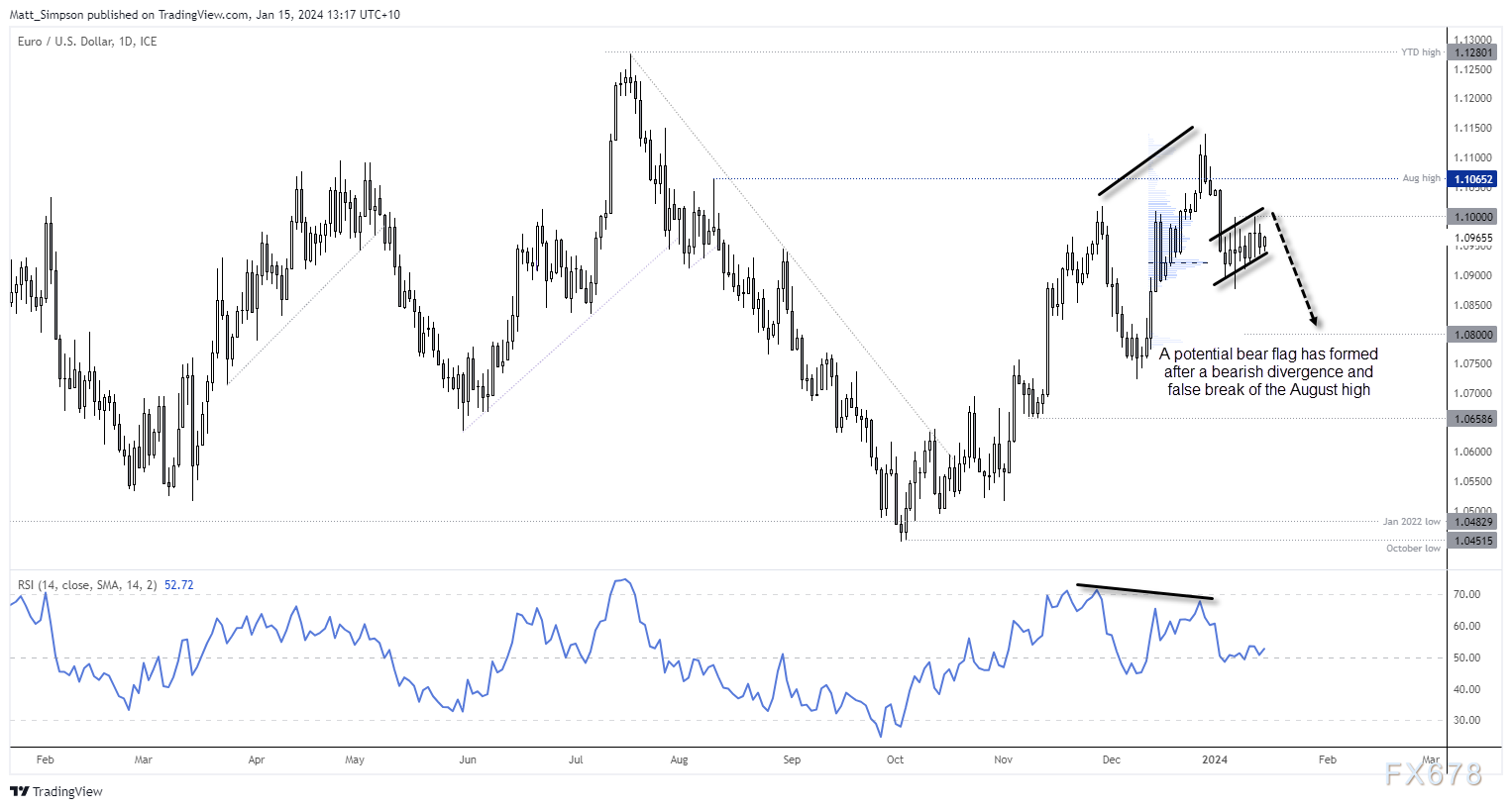 日线图上的相对强弱指数RSI(14)上形成了一个看跌背离,价格现在正在潜在的熊市形态内盘整。看空者可能寻求短期突破周期低点,看多者可能寻求逐渐向1.10移动,止损点在8月高点上方。空头可能会在周期低点的一个破位时进场做空,或者逆势交易者可能会在接近1.10时进场,并在8月高点上方止损。1.08短期起到支撑作用。