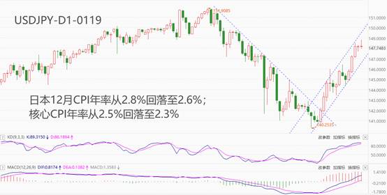 今日上午,日本总务省统计局发布数据:日本12月全国CPI年率2.6%,相比前值2.8%下降0.2个百分点;日本12月核心CPI年率2.3%,相比前值2.5%下降0.2个百分点。名义CPI和核心CPI双双下降,意味着日本的高通胀局面正在消失。日本央行将“长期通胀持续稳定保持在2%”当做目标,正是由于实际通胀率连续多月高于2%的目标,市场才会预期日本央行加息。然而,去年11月份,日本CPI年率已经下降0.5个百分点,12月份再次降低0.2个百分点。以目前的回落速度看,2%的目标底线将很快被跌穿。基于此,部分市场人士不再预期日本央行会很快加息,日元受利空冲击。
