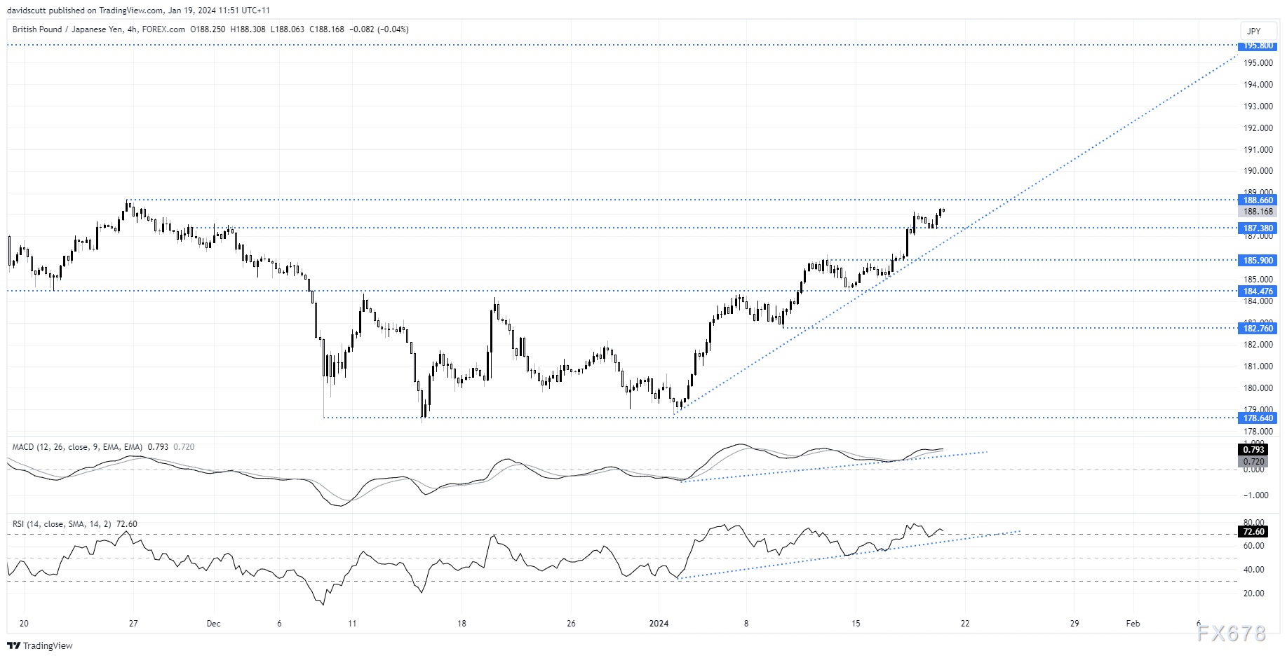 与美元/日元一样,英镑/日元也有类似的走势,这得益于英国央行对12月份强于预期的物价和服务业通胀数据做出的退出降息押注。如果它能顺利突破188.66——在12月底停滞不前的位置,那么在195点之前不会有太多明显的阻力,这为当前走势的延续提供了可能。