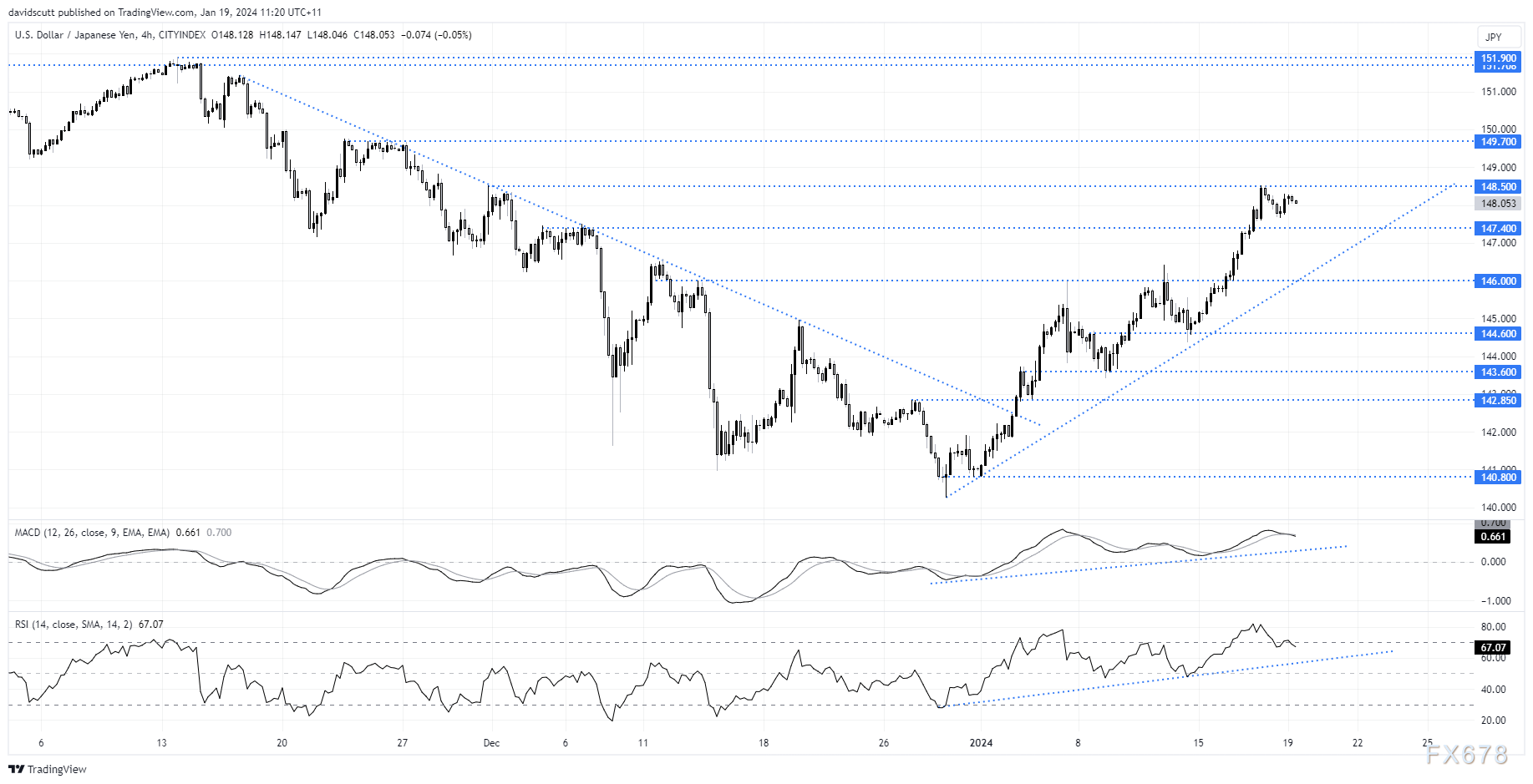 除非全球经济活动真正开始滚动,或者市场增加美国2024年降息近6次每次25基点的押注,否则美元/日元近期阻力最小的路径仍然是走高,正如RSI和MACD仍处于上升趋势显示的那样。