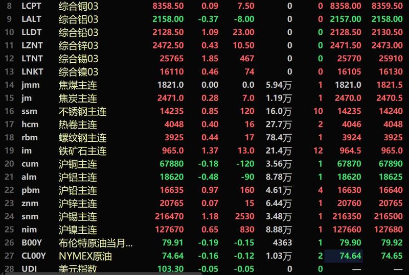 黑色系多飘红,铁矿涨1.37%,螺纹、热卷、不锈钢均上涨。双焦方面,焦煤收平,焦炭涨0.28%。