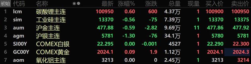 截至午间收盘,内盘基本金属普涨。沪锡涨1.18%,沪镍、沪锌和沪铅涨幅均在1%以内。沪铝、沪铜跌幅均在0.5%以内。氧化铝主力期货平于3213元/吨。工业硅主力合约跌0.56%。碳酸锂期货主力合约涨0.6%。