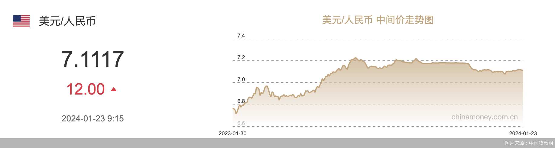 讯(记者廖蒙)1月23日,人民银行授权中国外汇交易中心公布,2024年1月23日银行间外汇市场人民币汇率中间价为:1美元对人民币7.1117元,前一交易日中间价报7.1105元,单日调降12基点。人民币中间价近期整体围绕7.11小幅波动。