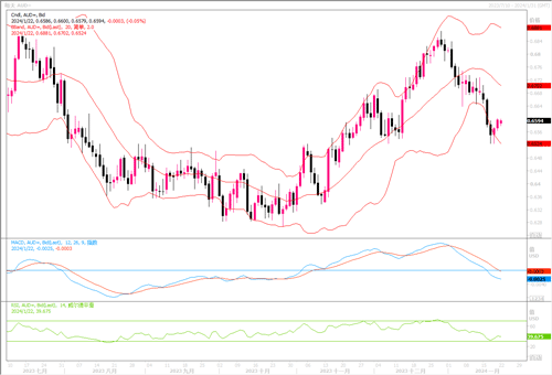 周五(1月19日),澳元兑美元上涨0.2%至0.6587美元,从上一交易日0.6525美元附近的支撑位有所反弹,但全周迄今仍下跌1.5%。澳洲联邦银行澳洲经济研究主管Gareth Aird说:“我们认为,澳洲央行今年将需要降息,以防失业率远高于4.5%,但我们的基本判断是宽松周期将从9月开始。”目前预计澳洲央行要到今年年底才会放宽政策,而不是年中。6月降息的可能性降至38%,8月行动的可能性为60%,9月为87%。但是,由于美国经济数据表现良好,且美联储官员极力打消提早降息的市场预期,美元指数保持反弹回升势头较猛。在美元强势压制下,澳元的表现也是节节后撤。日线图上,动量指标好坏参半,5、10和21日移动均线下滑,波林带通道区间下降,信号显示较强的偏空格局。首道重要支撑位在10-12月升势的61.8%回档位0.6500。只有收盘于下降的10日移动均线0.6632上方,方有望结束下行趋势。