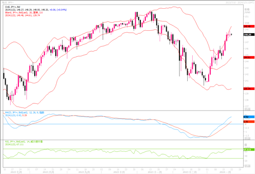 周五(1月19日),美元指数在连续五个交易日上涨后稍有停顿,当日出现微跌。但全周来说,由于近期的经济数据表现强劲和美联储官员的鹰派言论抑制了快速降息的预期,美元指数一周表现还是录得不错的上升幅度。美元兑日元上周五持平于148.15水平。日本央行定于下周一和周二召开政策会议,早些时候的数据显示,日本核心通胀率在截至12月的一年里放缓至2.3%,创下2022年6月以来的最低增长年率,这减轻了决策者迅速采取行动的压力,市场预期其可能会维持超宽松的货币政策不变。利率差上的劣势,恐将继续推动日元偏于弱势的走势格局。本周重点留意日本央行利率会议揭晓结果所带来的影响。从日线图上观察,美元/日元保持继续上行的态势未有改变迹象,技术指标均还处于明显上摆之中,显示美元多头力量仍占优。但短线需防范获利调整而出现小幅回落的风险。