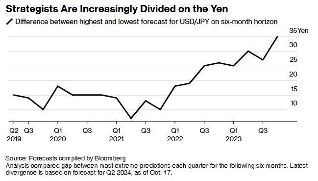 华尔街对日元的走势出现了巨大分歧。高盛、瑞穗美洲、摩根大通和美国银行认为,日元将跌至30多年来的最低水平。其他人则认为,美元兑日元汇率到明年一季度末将降至140,到2024年底将进一步降至130。事实上,根据媒体对未来6个月每个季度的汇率预测进行比较的分析,华尔街分析师们现在的看法是自2016年以来分歧最大的。