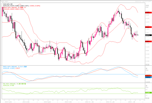 周三(1月24日),澳元兑美元在0.6575附近徘徊。进入新的一年后,由于交易商推迟了对美联储首次降息的预期时间,美元一直表现坚挺,澳元则受压一路下行,目前勉强守护在0.65水平之上。周三日内,尽管中国宣布降准的刺激经济发展的利好消息,且铁矿石价格上涨,但对澳元的刺激影响不大。当前市场关注的焦点还是放在美国周四、五的放映经济发展和通胀数据上。在左右澳元的走势中,美元的走势仍占主导影响。日线图上,澳元/美元仍处于布林带通道中轨线下方,汇价继续处于窄幅整理之中,技术指标下摆还在延续中,显示澳元的弱势格局未有改变。预料美国周四和周五所公布得GDP和核心个人消费支出(PCE)公布后,澳元/美元或有望走出窄幅整理走势的局面。