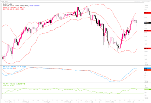 周三(1月24日),美元周三下跌,投资者目前正在关注周四将出炉的美国第四季度国内生产总值(GDP)初值,以及周五公布的另一项通胀数据--个人消费支出(PCE)物价数据。数据出炉之前,投资者整固头寸,美元近期涨势暂作喘息。美元兑日元当天下跌0.5%,收盘于147.58。 在日本央行总裁植田和男周二声称实现日本央行通胀目标的可能性正在逐步升高之后,日本公债收益率跃升至六周高点,日元则追随日债收益率走势略有回升。美元/日元后续走势则要视乎本周四、五美国重要经济数据的表现。若数据强劲,将进一步降低美元利率及早降息预期概率,美元/日元有极大机会继续修补2023年第四季跌势。相反,美元/日元可能再次呈现高位遇阻回落的行情。日线图上,美元/日元继续面临调整的风险,但隔夜带长尾线的阴柱体且收盘价继续拉上至147之上,表明美元多头暂时未有撤出的意愿。留意周四及周五美国数据公布结果对市场的扰动。