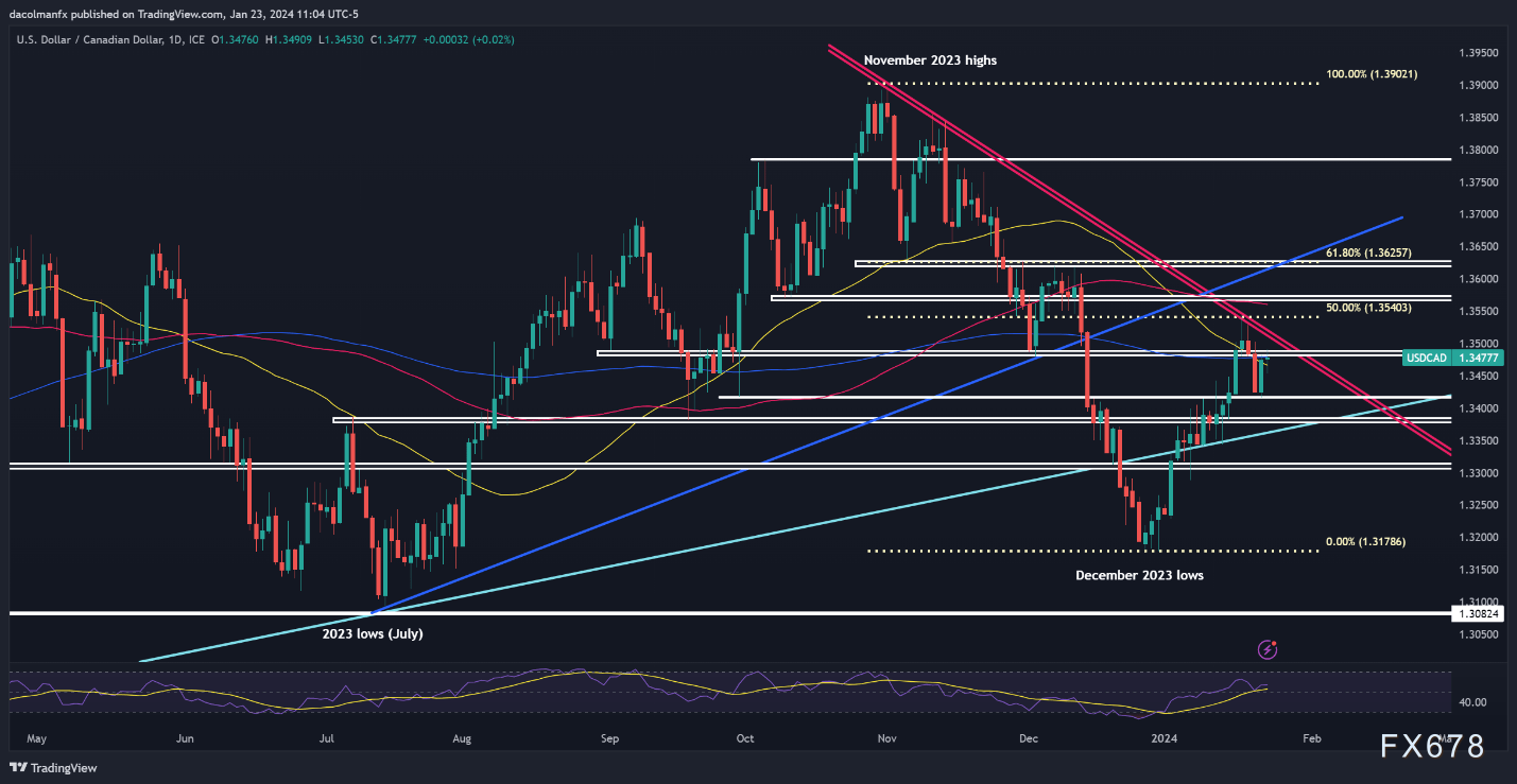 在上周晚些时候大幅回调之后,美元兑加元在过去两天收复失地,克服了过程中的重大障碍,包括200日和50日简单移动均线。如果未来几天涨势加速,趋势线阻力位出现在1.3500。如果价格继续走高,下一阻力将在1.3540,也就是去年11月和12月下跌时的50%回撤位。