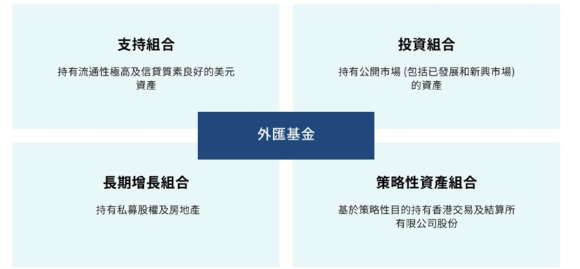 资料显示,外汇基金含四大组合。支持组合、投资组合、长期增长组合和策略性资产组合。其中支持组合占据外汇基金的主要部分。它持有流动性佳、信用资质好的美元资产。支持组合之外,投资组合持有公开市场资产,包括发达国家市场和新兴市场资产。第三是长期增长组合持有私募股权和房地产地产为外汇基金的另类资产组合。最后是策略性资产组合,持有香港交易及结算所有限公司股份。