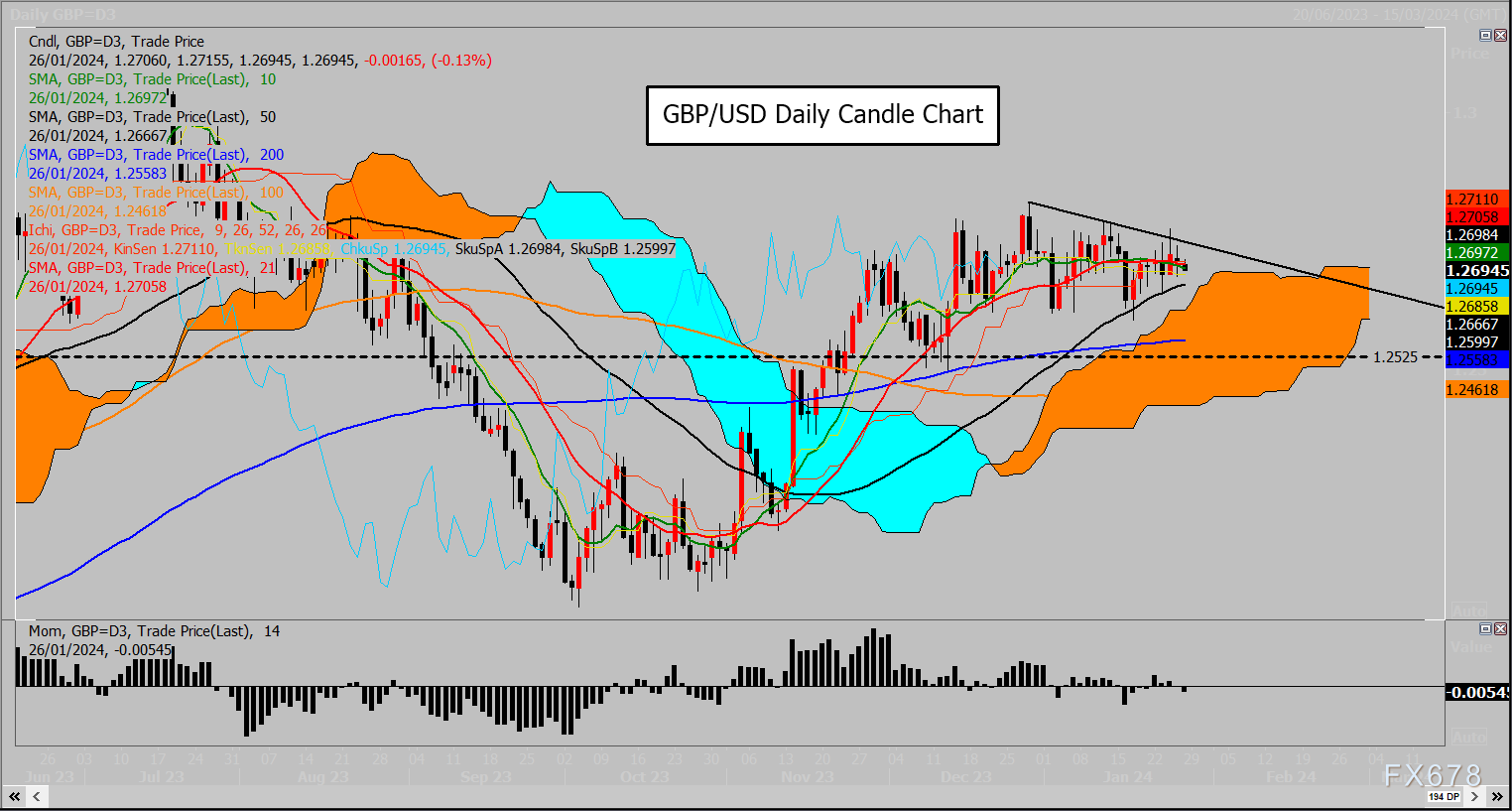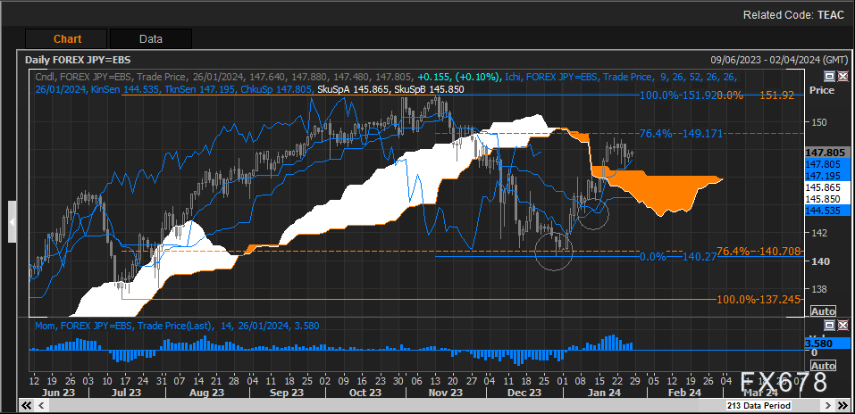 美元/日元价格在日线一目均衡云云区(目前横跨144.71-146.44区域)上方和149.17(11-12月从151.92到140.27跌势的76.4%回撤位)之间波动。