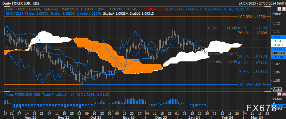 欧元/美元位于12月1.0724至1.1139涨势的76.4%回撤位1.0822上方,如果日线收盘价低于该价位行情将进一步走弱。