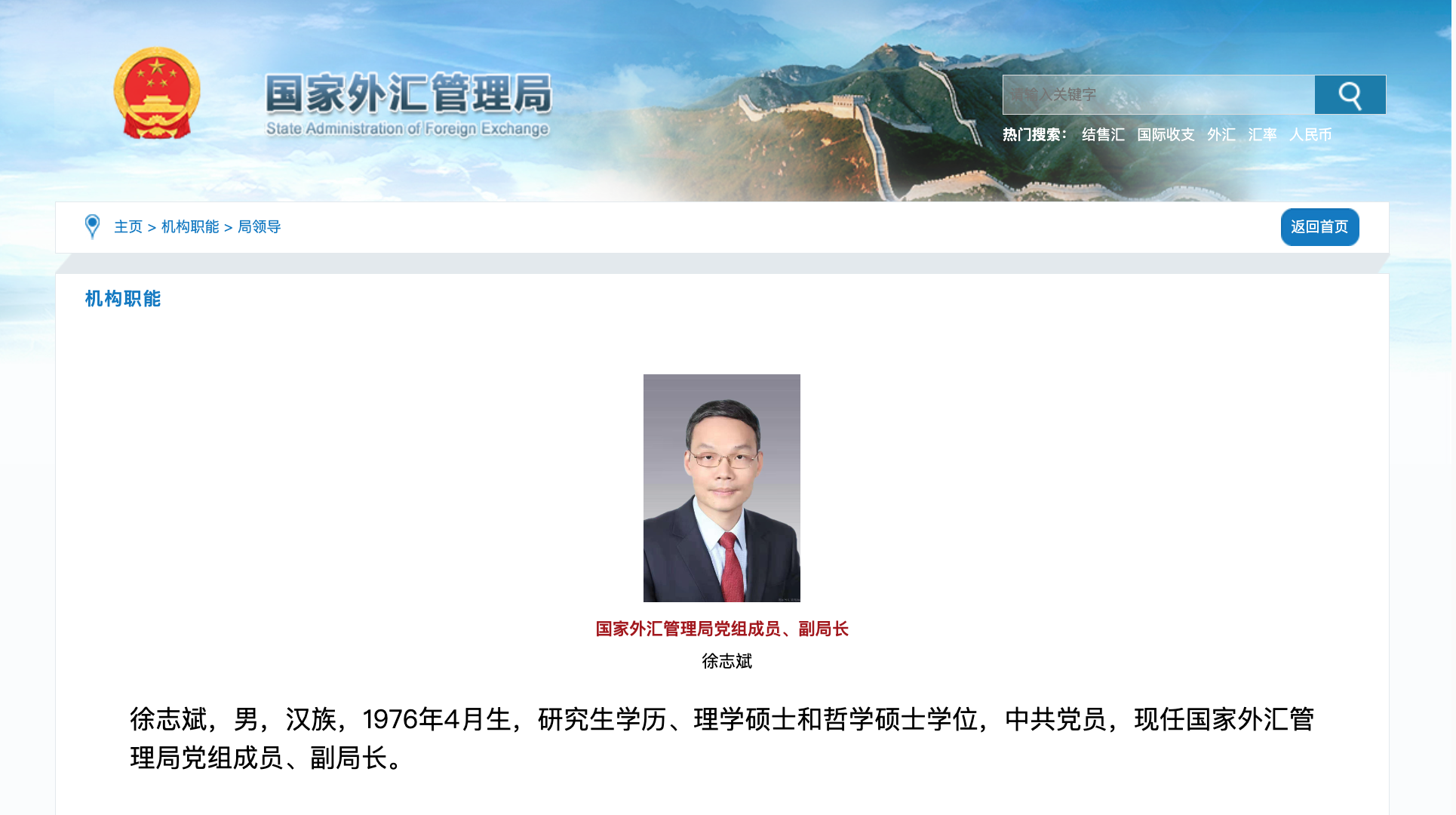 据人力资源和社会保障部网站消息,国务院任免国家工作人员。任命徐志斌为国家外汇管理局副局长。截至发稿,国家外汇局官网“局领导”一栏已更新相关信息。