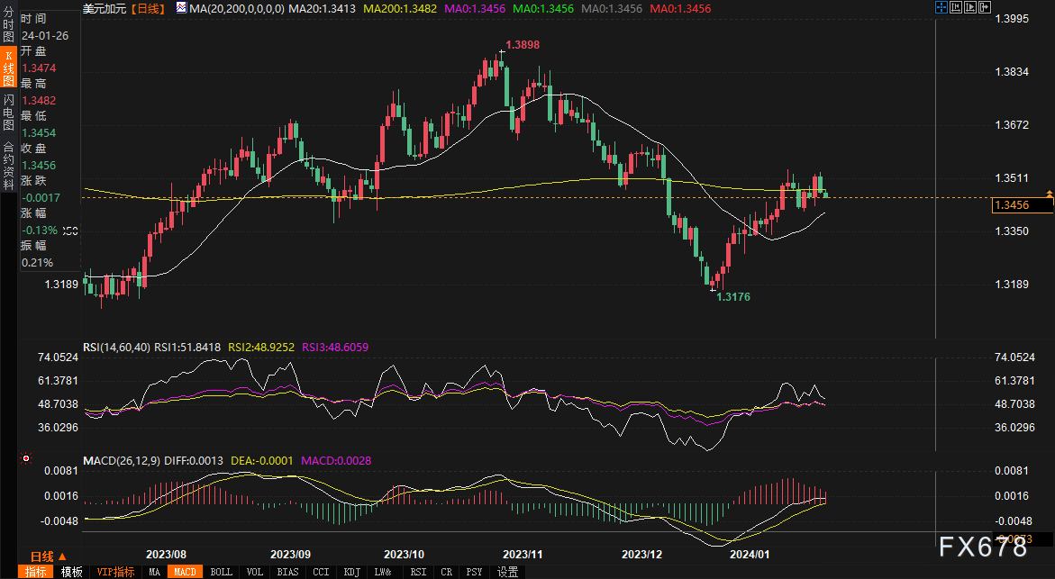 汇通财经APP讯——周五(1月26日),欧盘时段,美元兑加元窄幅波动,向上测试200日均线后一路回落。截至发稿,美元/加元报1.3464/65,跌0.07%。