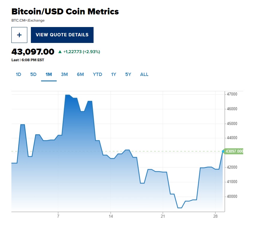 根据Coin Metrics的数据,比特币最新交易上涨2.93%,至43097.00美元。在人们期待已久的比特币现货ETF获得批准后,比特币今年出现了大幅下跌,但在最近重新恢复涨势。比特币在2023年收于42000美元左右。2024年迄今,该加密货币累计上涨约1.25%。