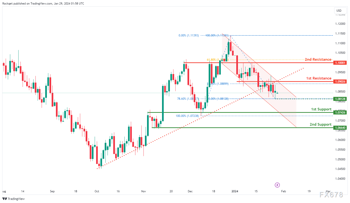 还有一个中间支撑位在1.0812,这是一个波动低点支撑位,与78.60%斐波那契回撤位一致。这个中间支撑位在看跌过程中增加了额外的支撑。