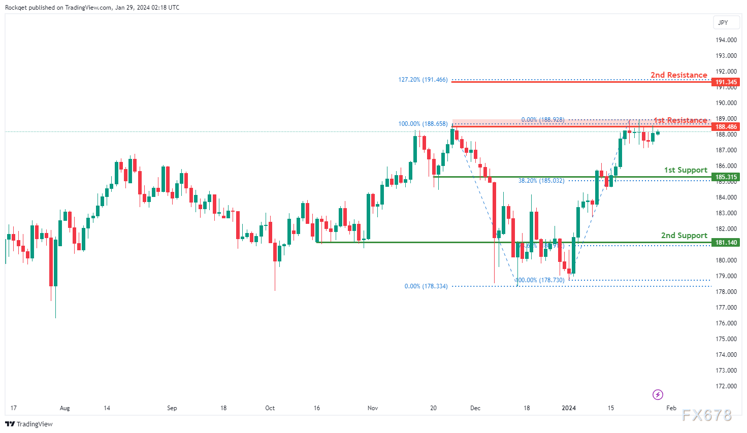 在阻力位方面,第一个阻力位188.480的特征是多波段高阻力位,表明它代表了价格遇到阻力的历史点。