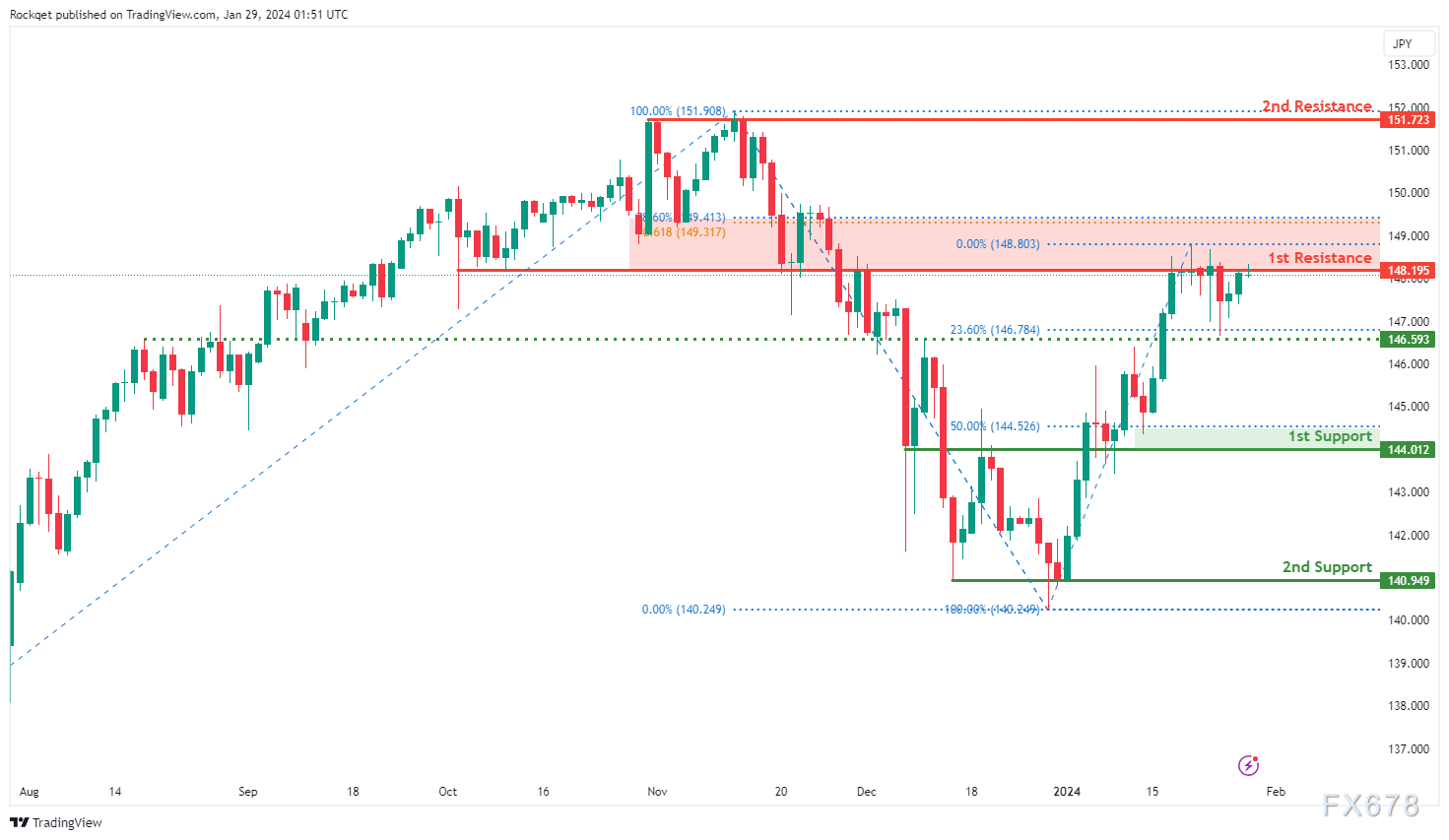 在阻力位方面,第一个阻力位148.19被认为是一个重叠阻力位,表明这个价格水平在历史上既是支撑位也是阻力位。这使得它成为一个可能出现抛售压力的潜在障碍。