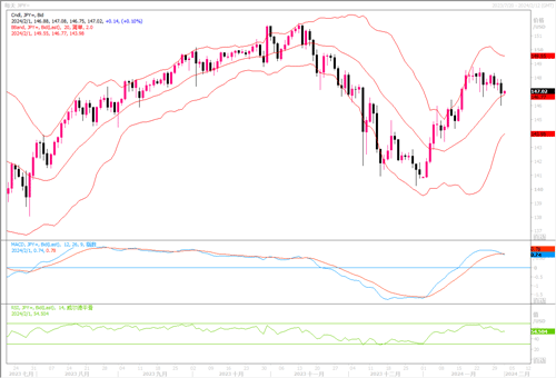 周三(1月31日),美元指数纽约尾盘上涨0.26%,报103.66。美联储周三维持利率不变,并放弃了长期以来关于可能进一步提高借贷成本的说法。但联储并未暗示很快将降息。交易员们认为,随着转向偏中性,美联储此次会以鸽派措辞来配合这一转向。但美联储没有这样做,相反,美联储在声明中增加了一些鹰派措辞。美联储主席鲍威尔在新闻发布会上更是表示,美联储需要看到更多有利数据,才能确定是时候降息了。他说:“我们确实有信心,但我们希望获得更大的信心”,即降温的通胀数据发出了“真正的信号”。但是当日美元兑日元下跌0.25% 至147.26,盘中最低曾抵达146水平。这主要是美联储宣布维持率不变给到日元一定的回升理由。此外,周三的一份会议记录显示,日本央行决策者在1月份讨论了近期退出负利率的可能性以及逐步退出该行大规模刺激计划的方案。1月会议意见摘要显示,央行的决心正在增强,且有愈来愈多委员认为结束负利率的条件正在逐步具备。若本周后续的美国经济数据一般,美元/日元或存在继续回落的趋向。日线图上,前段时间横盘的低位支撑已下破,目前价格盘旋于布林带中轨线(146.80)附近,若跌破,美元/日元回落幅度将加大。上方看来在149附近构成了较重的阻力。