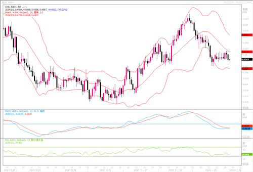 周三(1月31日),澳元兑美元下跌0.3%,报0.6581,远离周二触及的两周高点0.6625美元。周三稍早,澳洲公布第四季消费者物价指数(CPI)增长率放缓至4.1%,创两年低位,且低于预期的4.3%,与第三季的5.4%相比大幅下降。核心通胀率从5.2%降至4.2%,低于澳洲央行自己预测的4.5%。弱于预期的数据为澳洲央行比多数人预期的更早降息铺平了道路。外界认为澳洲央行肯定会在下周的政策会议上维持利率在4.35%不变,并可能软化其紧缩政策倾向。利率期货市场暗示6月首次降息的可能性从数据公布前的54%上升到64%左右。目前,8月降息25个基点的可能性已被完全消化,2024年的总降息幅度预期也从42个基点升至48个基点。与美元相比,在利差因素方面遭到进一步削弱之下,澳元走势变弱。日线图上,澳元/美元整体仍处在布林带通道中轨线之下,技术指标亦没有明显转向痕迹,澳元整体走势仍偏于弱势。下方关键的支撑在0.65,若下破,澳元/美元将延续跌势。上方只有彻底突破横盘区间的阻力水平0.6625,方有望转跌回升。