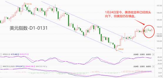 技术角度看,美元指数处于中长期下跌趋势的反弹阶段,反弹波段整体呈现出横向波动特征。1月24日开始,美债收益率已经拐头向下,但美元指数仍在横盘震荡,没有出现明显下跌。传统逻辑认为,债券收益率是美指变动的根本动力,美元指数的后市发展承压下行概率较高。震荡指标KD的读数处于相对高位,快慢线交叉缠绕,短期可能延续震荡格局。MACD指标的柱线处于零轴上方,但绝对值较低,多头动能不足。综合来看,多数指标认为美元指数短期将延续横向波动,中期可能跟随国债收益率回落。