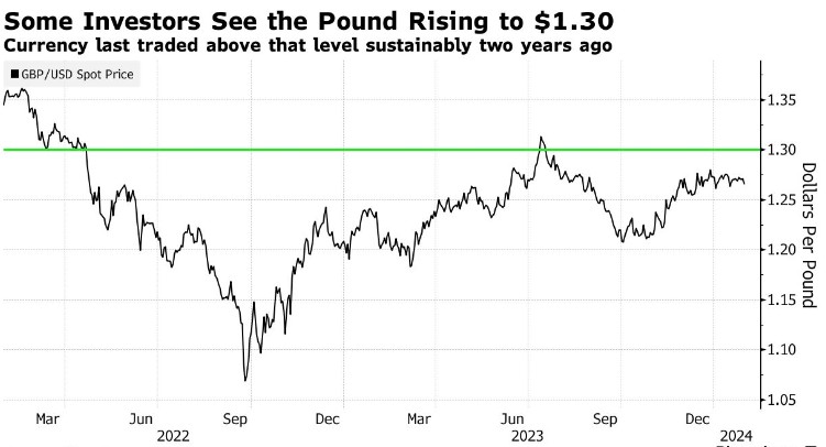 获悉,越来越多的分析师预计英镑兑美元将反弹至1.30,他们认为英国央行将不愿像其他央行那样迅速降息。包括高盛在内的投行也在关注这一水平,称经济增长强于预期。而投资机构PGIM Fixed Income则强调关注保守党在选举年推动减税的可能性。两者都将使通胀居高不下,并要求收紧货币政策。