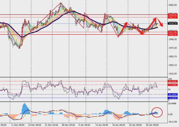 技术面:黄金H4级别反弹遇阻回落,并在48日多空分界线上方运行,此外,MACD双线和量能柱开始缩量向下。若美联储主席鲍威尔未能如预期在3月份开始政策转向,金价可能回落至2000美元附近;若鲍威尔暗示美联储在3月份降息,金价有望攀升至2070美元以上。