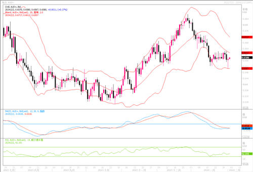 周四(2月1日),澳元兑美元报0.6565美元,回到了过去两周来的0.6550-0.6620美元区间。周三美联储的利率会议虽浇冷了3月降息预期,但交易员们坚持押注美国利率将在今年晚些时候大幅度下降。这在一定程度上缓解了澳元因周三公布大于预期的通胀缓和数据下跌势头。过去两个月,经济发展基本符合澳洲央行预期,劳动力市场趋于宽松,在生活成本压力下消费者支出疲软,商品通胀趋缓趋势仍在继续。然而,主要受内需影响的非贸易商品和服务通胀仍达5.4%。租金通胀略有回落,但仍高达7.3%,而保险价格则跳涨16.2%,创2001年以来最强年涨幅。穆迪分析经济学家说,澳洲通胀将继续下降,但速度会放缓。因此,穆迪认为澳洲央行在9月才会降息。若澳洲晚于欧美主要经济体降息,或能成为支撑澳元回升的影响因素。日线图上,隔夜澳元/美元在测试0.65的强支撑后迅速回升,再度回到0.6550-0.6220的横盘区间内,各类技术指标在超卖区域钝化,显示澳元下行动能有所减弱。在没有重大刺激因素出现的情况下,预料澳元/美元仍难以脱离区间横盘震荡的走势格局。