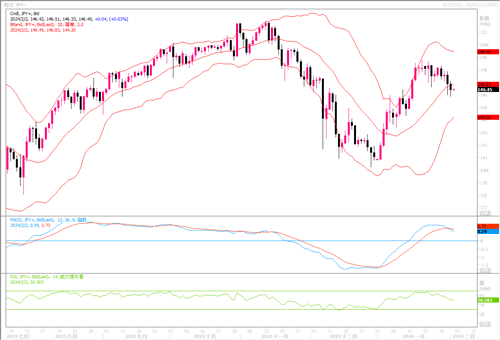 周四(2月1日),美元指数尾盘下跌0.55%,报103.04,美元兑日元下跌0.45%,收盘报146.29。美联储主席鲍威尔周三在利率会议之后表示,利率已经见顶,将会在未来几个月降息。美国通胀继续下降,预计就业和经济将会持续增长。但他拒绝宣布持续两年的抗通胀行动已经取得胜利,也没有确认已经实现了联储追求的经济“软着陆”,更没有承诺最快将在3月19-20日的会议上降息。即便如此,根据芝商所的FedWatch工具,交易商目前预计3月降息的可能性为39%,5月降息的可能性为94%。此外,周四银行股继续遭抛售,延续了前一天的跌势,因当日纽约社区银行NYCB.N报告其商业房地产投资组合出现亏损。金融业的因高成本所带来的风险性担忧也可能提振了避险日元。而消息面传出日本央行1月表明鹰派倾向,就退出刺激政策展开讨论,也对日元构成支撑。日内关注美国非农数据情况,若就业市场也开始松缓,势必加强美联储5月降息的押注,如此日元则存在着极大的回升可能性。日线图上,美元/日元开始落于布林带中轨线之下,MACD形成死叉,显示美元回落走势变得明显。下方继续留意近期的初步支撑146是否能破位,若下破,下方跌幅将会加深。