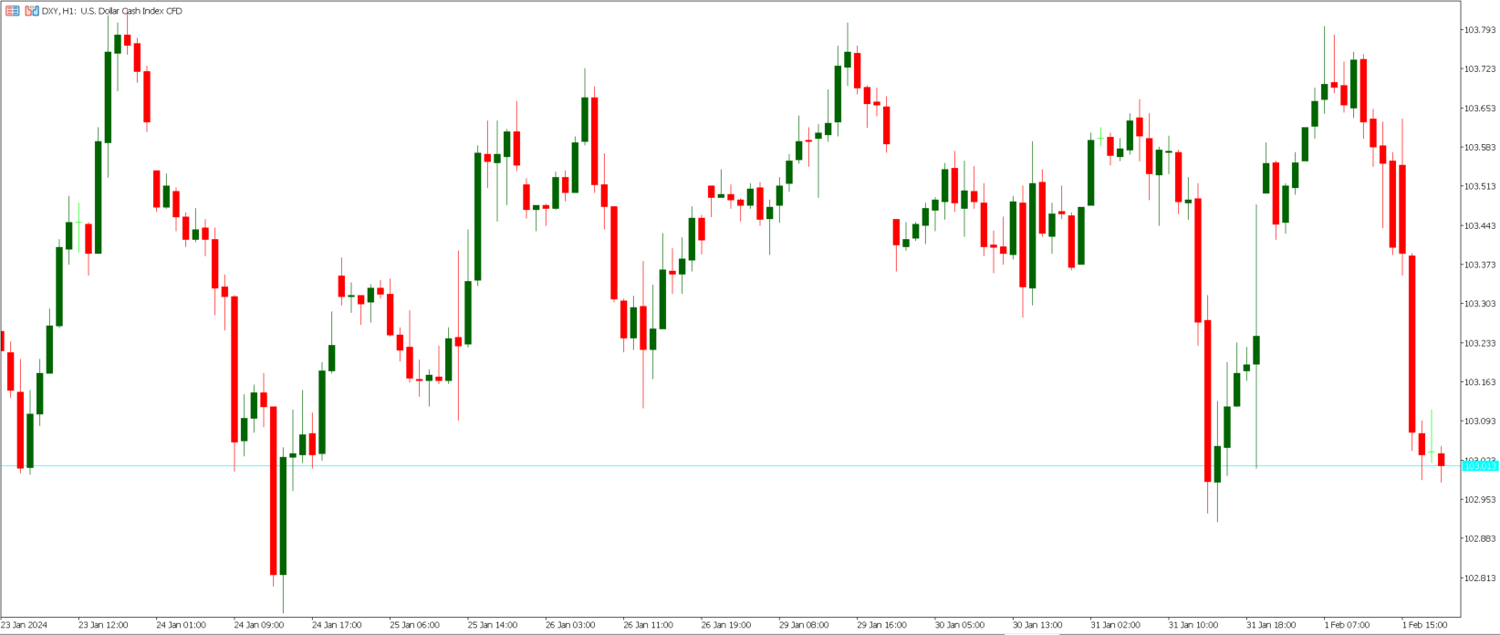 今天是2024年2月2日(周五),昨日凌晨美联储公布利息决议不变,随后美联储更是发表鹰派言论,受此影响,美元指数(DXY)大幅回升,让市场一度以为美元即将开始新一轮的上行趋势。然而,昨天晚上美国纽约社区银行公布第四季度意外亏损并大幅减息后,该公司股价大跌超过8%,随之KBW银行、SPDR银行股价都大幅下跌,给刚刚抬头的美元指数(DXY)当头一棒,从103.740急转直下,一路跌破了103。