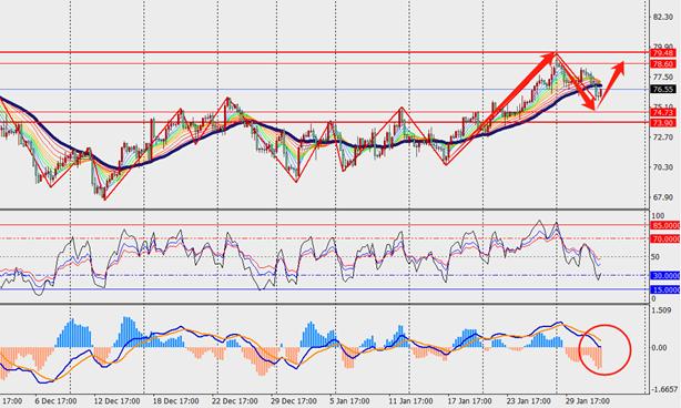 第一阻力位:78.70 第一支撑位:74.00