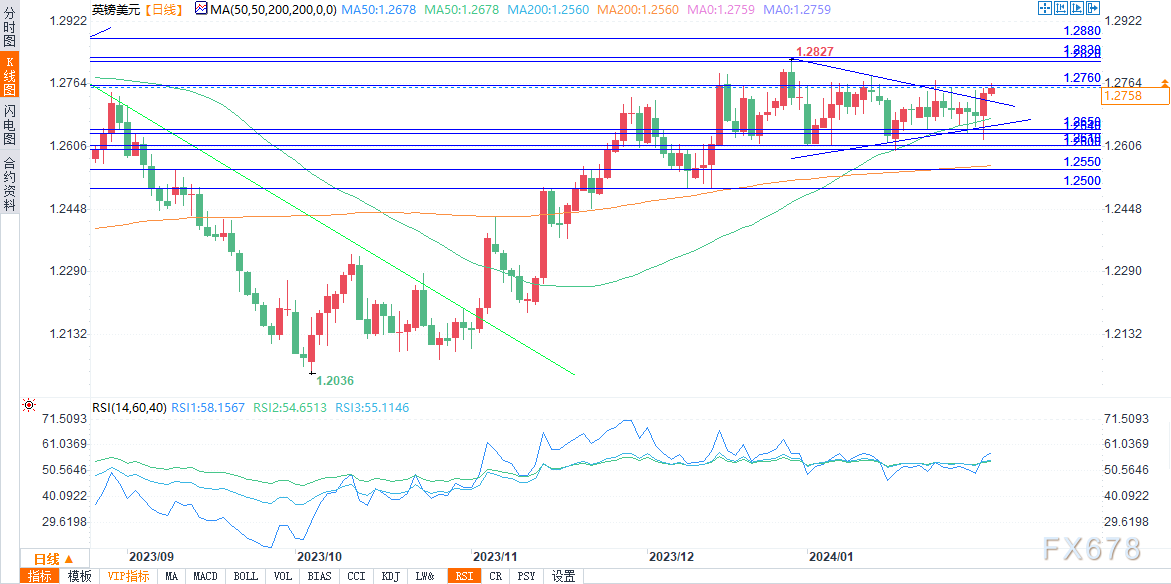 从技术分析角度看,英镑/美元的价格走势出现积极因素。目前汇率处于从2023年10月4日低点1.2037至2023年12月28日高点1.2828的上升趋势阶段的一个盘整时期。自2023年12月28日以来,汇率巩固了“对称三角形”形态范围。