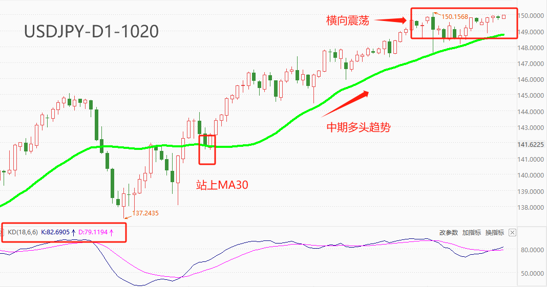 技术角度看,USDJPY在8月7日站上MA30均线开启中期涨势,至10月3日距离波动后进入震荡状态,期间最高触及150关口,但市场行情迟迟不选择突破。最近五根K线四阳一阴,但K线振幅均较低,方向性不明确。震荡指标KD的读数分别为82/79,已经达到超买区域,行情继续上涨的空间有限。综合来看,技术指标给出涨势乏力,可能展开回调的判断,但MA30依旧是强有力的中短期支撑。