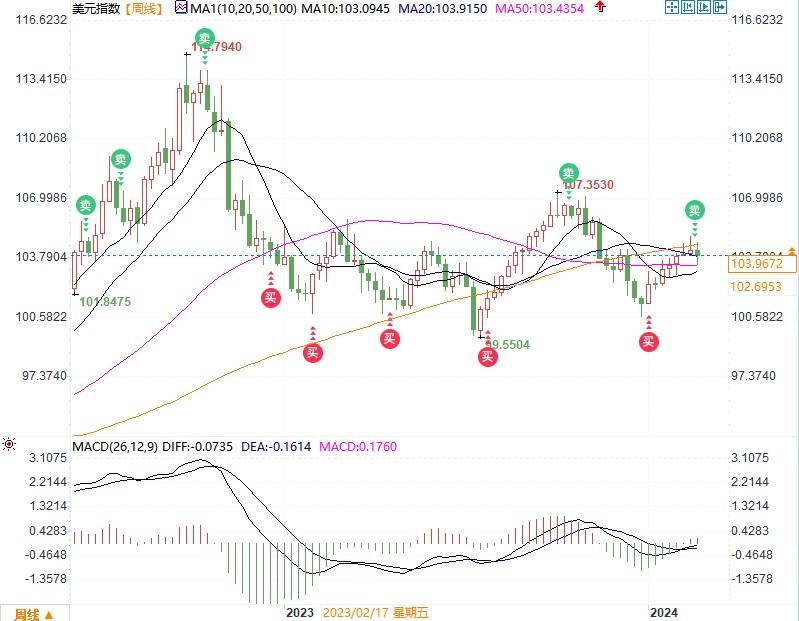 美元指数周五报103.93点,当日变化不大,周跌幅0.29%。美元指数从12月28日创下的五个月低点100.61反弹,目前维持在2月14日创下的三个月高点104.97下方。