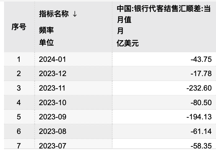 王静也告诉记者,整体来看,2024年1月,银行代客结售汇逆差额43.75亿美元,继续延续一定逆差规模,反映在中美利差倒挂较大背景下,居民和企业端仍有一定购汇意愿。