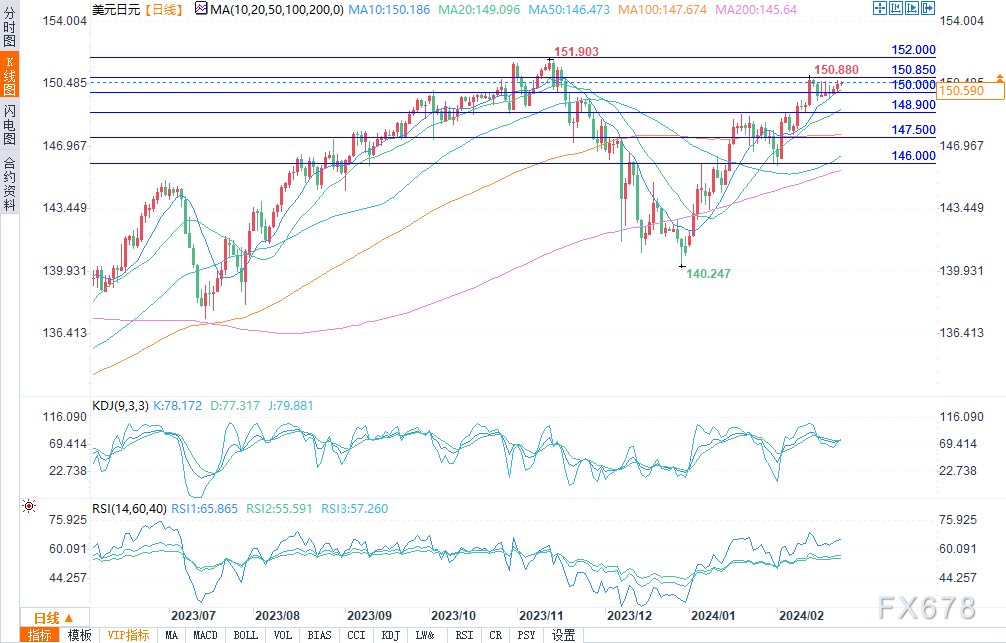 美元兑日元周四攀升,接近150.85阻力位。如果汇率未来几天涨势加快并上破151.00关口,买家可能会大胆发起对去年高点152.00附近的看涨攻势。