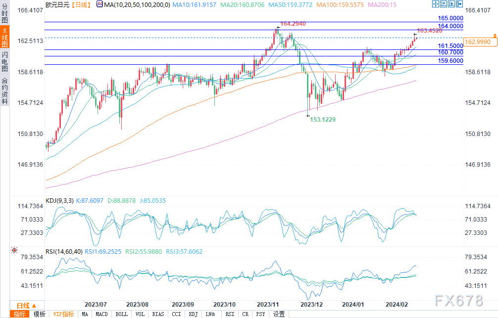 欧元兑日元周四延续涨势,接近去年高点164.00阻力附近。看空者需要坚决捍卫这一上限,如果做不到这一点,汇率可能将向上推至趋势线阻力位165.00。