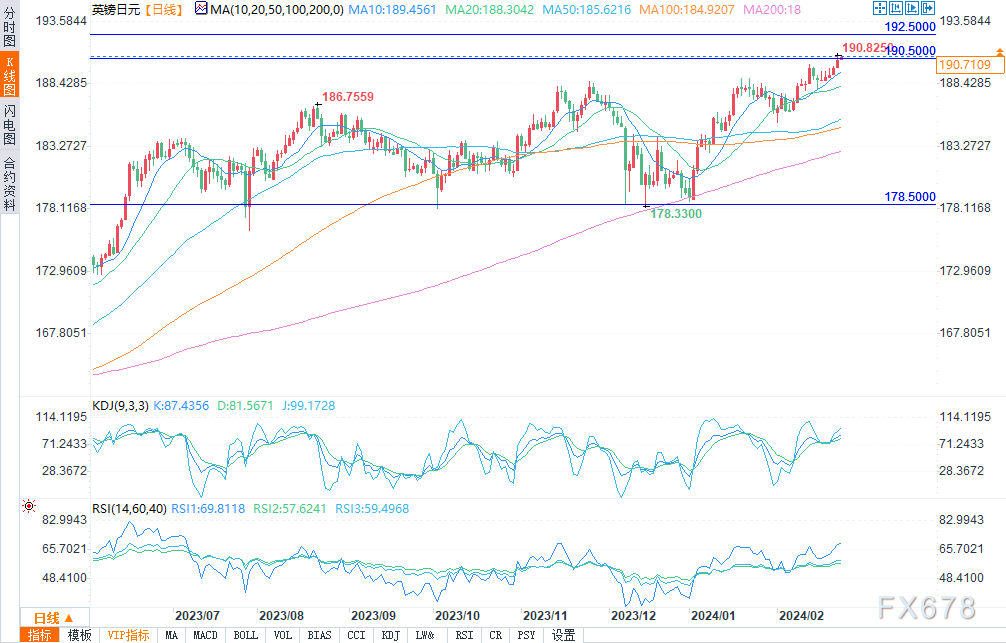 英镑兑日元周四反弹,触及190.50上方的多年新高。由于看涨势头完好,短期内可能会有额外的上行潜力,下一个阻力位在192.50,随后是196.00,上破这一阻力标志价格达到自2015年以来的高点。