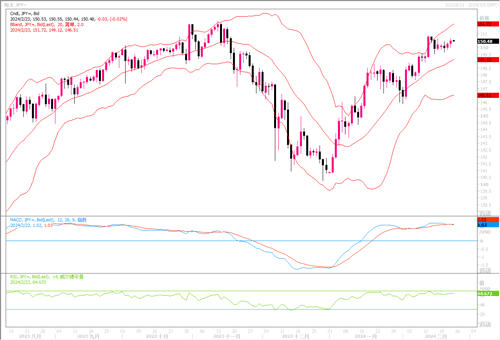 周四(2月22日),美元指数周四略微下跌,但脱离三周低点,收盘于103.95。而美元兑日元则上涨0.17%至150.53,略低于2月13日触及的三个月高点150.88水平。日本财务大臣铃木俊一周四表示,政府对汇率没有“防线”,但有必要监控市场波动,因此虽然日元持续走软中,但交易员对于进一步推低日元的交易还是显得较为谨慎。周四出炉的美国数据显示,上周初请失业金人数意外下降,而美国2月企业活动降温,投入物价指数降至近三年半以来的最低水平。1月成屋销售增长3.1%,经季节性因素调整后年率为400万套,为去年8月以来最高。数据未能推动美元上升。市场的目光放在了下周公布的个人消费支出(PCE)物价指数,以了解有关美联储政策的线索。目前强劲的美国经济数据使美联储有望推迟降息,并为美联储“较长时间内将维持利率在高位”的前景提供支撑,美元为此近期也是深受抬捧。但不可忽略的是,日本央行4月退出刺激政策的乐观预期不断升温,可能会减缓美元涨势。日本央行前审议委员樱井真表示:若工资强劲增长,日本央行或3月结束负利率。若日本央行仅仅停留在口头表示而未有实际的动作,预料对日元的刺激有限。日线图上,美元/日元仍处于高位小幅整理之中,由于忌惮日本央行的干预,美元/日元走势显得有点踯躅不前。继续留意上方151阻力水平能否上破。