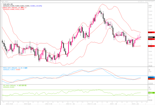 周四(2月22日),澳元兑美元持平于0.6554,隔夜高见0.6572。因市场押注日本央行将保持宽松政策,澳元兑日元交叉盘汇率创下了九年来的新高,继续在兑美元的直盘交易中给予间接的支撑。澳元兑美元连续7个交易日上涨,似乎是受益于中国经济的改善。澳元兑美元在从2024年低点0.6441反弹后重新获得了牵引力,多头在成功上破200天均线后,似乎有重拾信心进行逆转的趋向。日线图上,澳元/美元维持着小幅上探的走势倾向,汇价继续维持在布林带通道中轨线之上呈上行的轨迹,各项技术指标也配合性地展开上摆的趋向,显示澳元多头继续尝试推高澳元。近期继续留意上方0.66的阻力情况,若能破位澳元/美元有望全面逆转跌势转而发力上行。