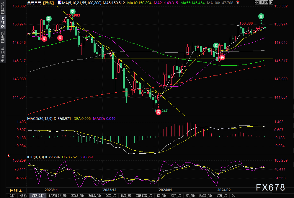 美元/日元重返151关口,将支撑其升至151.889阻力位。