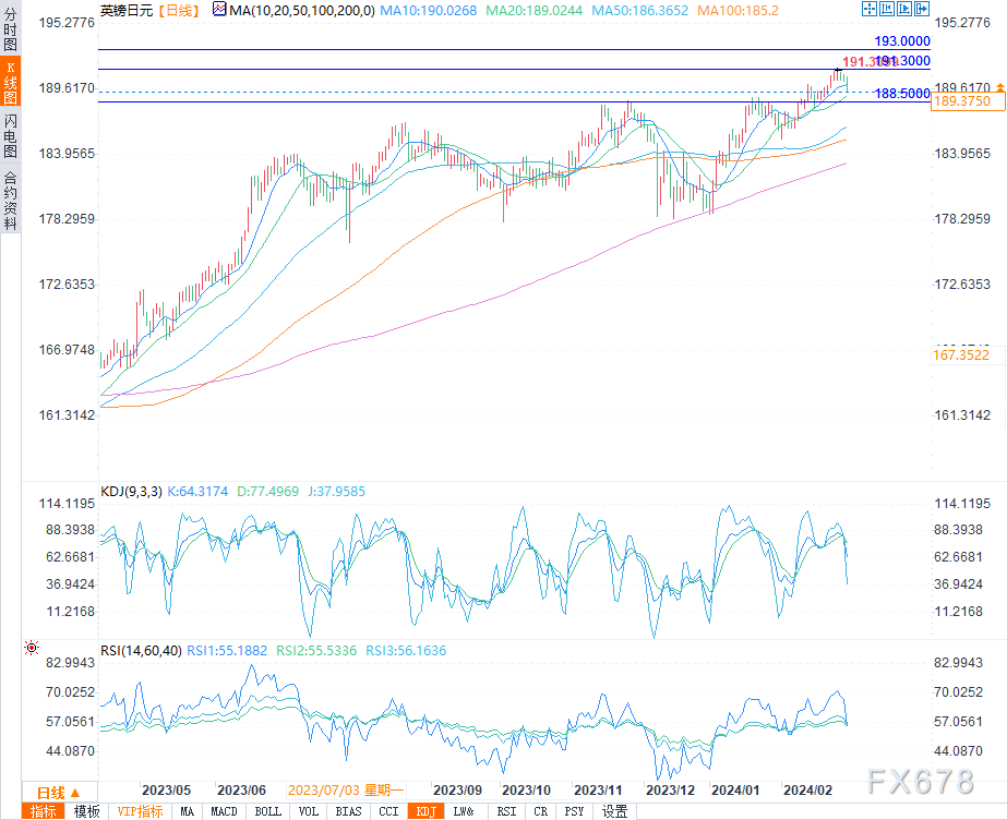 继本周早些时候攀升至191.00以上的多年高点之后,英镑兑日元开始回落,目前价格在1月高点188.92上方交易。如果行情走弱,汇率可能进一步跌向188.50英镑。从这个关口开始的进一步下跌可能会将注意力转移到50日简单移动均线上。