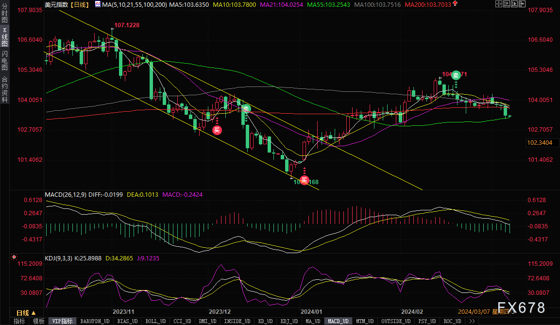 追踪美元兑六种主要货币的ICE美元指数周三下跌0.40%,受报103.37,为2月2日以来最低收盘水平,正式跌破200日均线103.70关键位置。周四(3月7日)亚市早盘,美元指数维持弱势,目前交投于103.30附近,跌幅约0.06%。