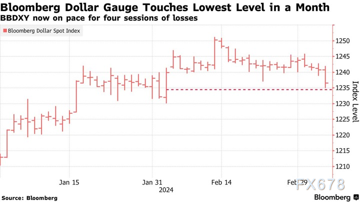 彭博美元即期指数周三盘中一度下跌0.5%,创一个多月来最大跌幅。美联储主席鲍威尔周三向美国立法者重申,只要通胀数据继续显示改善,今年可能会降息。