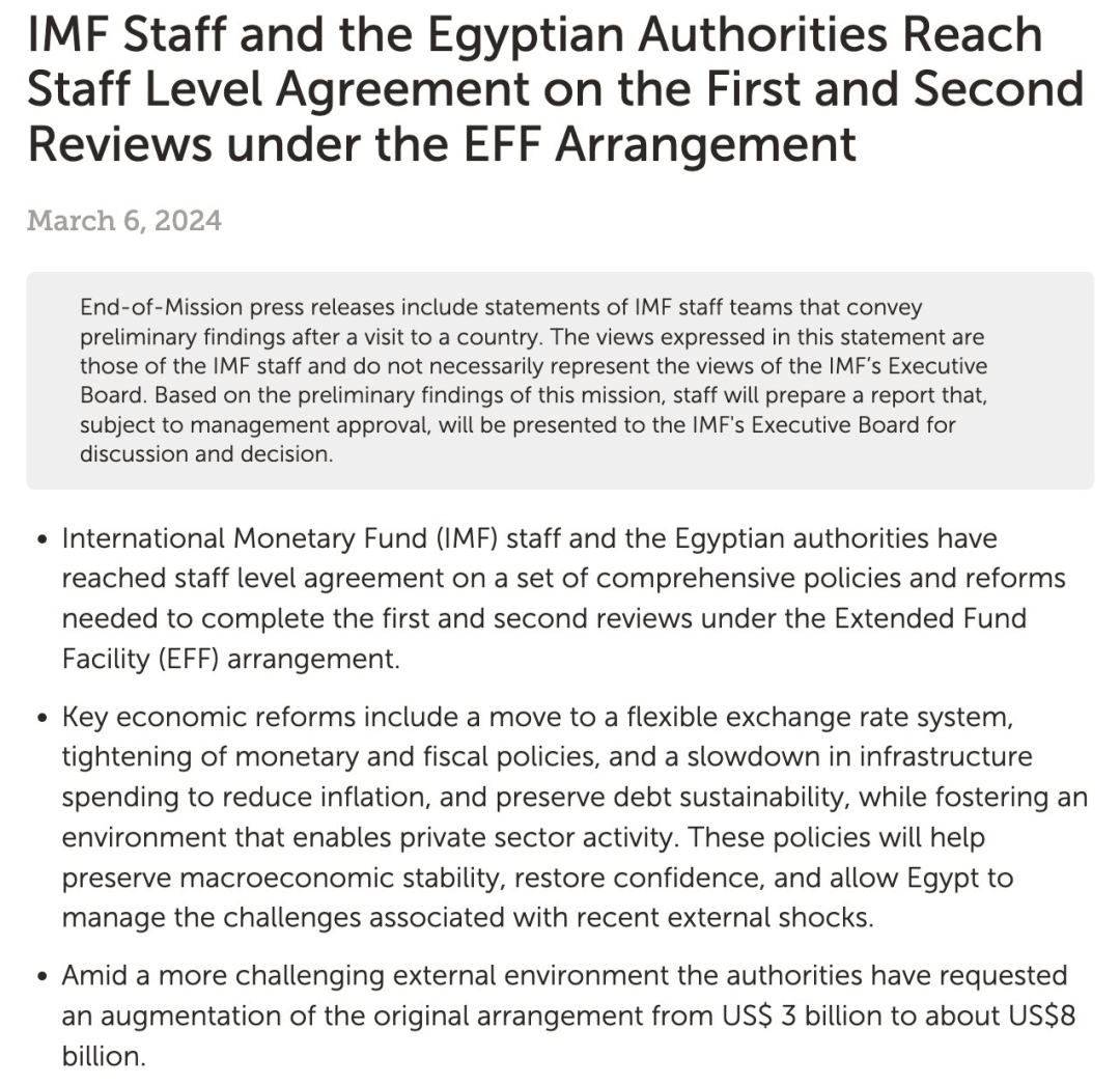 随着创纪录的加息和货币贬值,当地时间3月6日,国际货币基金组织(IMF)宣布,与埃及就第一次和第二次审查所需的经济政策达成专家级协议,将向埃及提供的贷款额度从30亿美元提高至80亿美元。