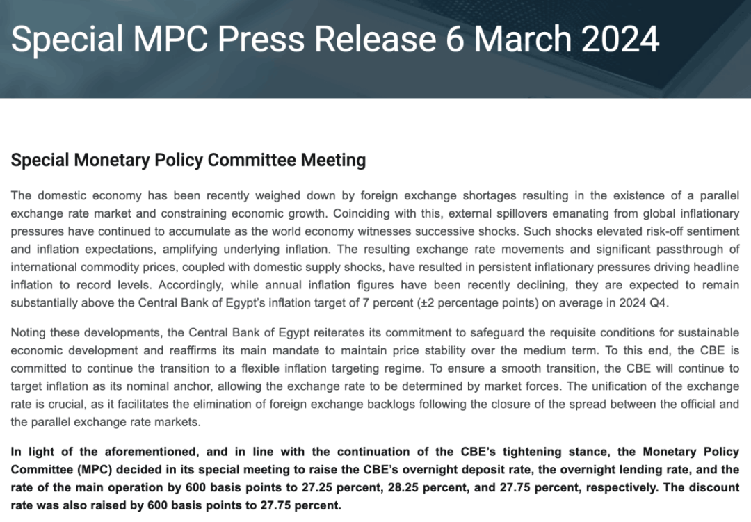 当地时间3月6日,埃及央行宣布,将关键利率上调600个基点,并允许汇率由市场决定,以确保向灵活的通胀目标制平稳过渡。这也是继今年2月加息200个基点之后的又一次大幅加息。