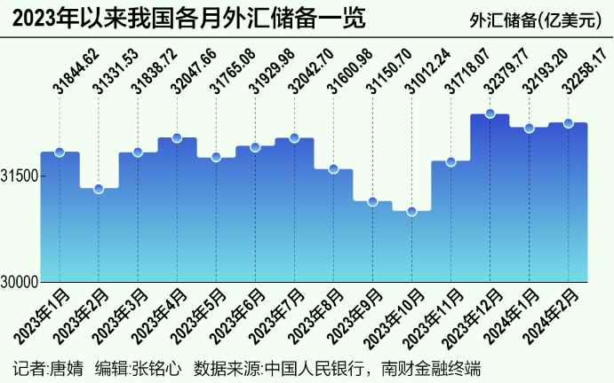 记者唐婧 北京报道 国家外汇管理局3月7日发布数据显示,截至2024年2月末,我国外汇储备规模为32258亿美元,较1月末上升65亿美元,升幅为0.20%。值得注意的是,这已经是我国外汇储备连续三个月站稳3.2万亿美元大关,而2023年外汇储备全年稳定在3.1万亿美元以上。