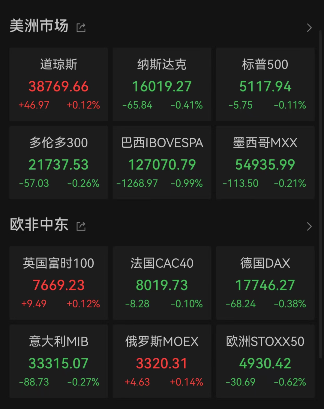 美股市场延续调整,三大指数涨跌不一,道琼斯工业指数上涨0.12%,纳斯达克指数、标普500指数分别下跌0.41%、0.11%。